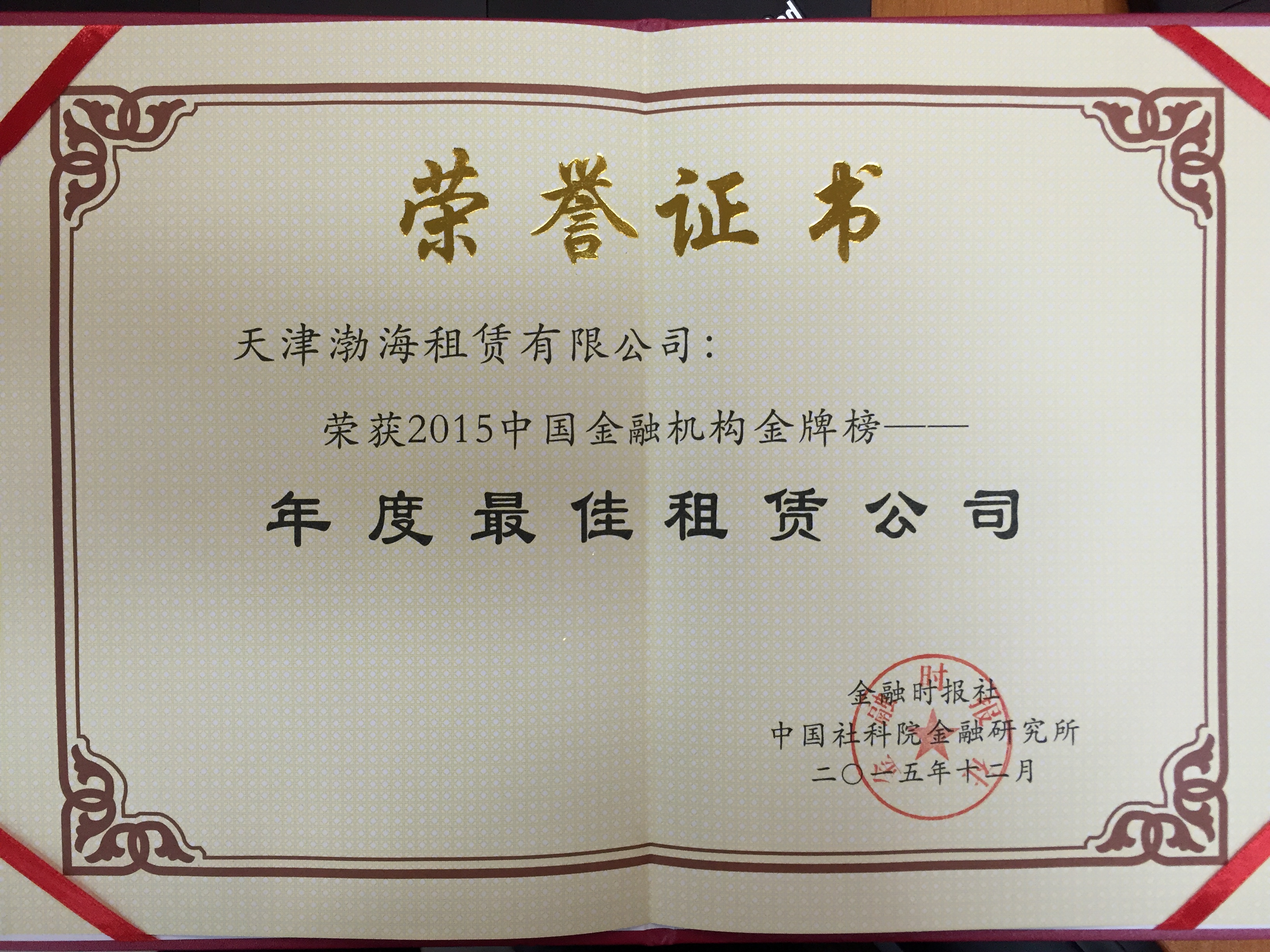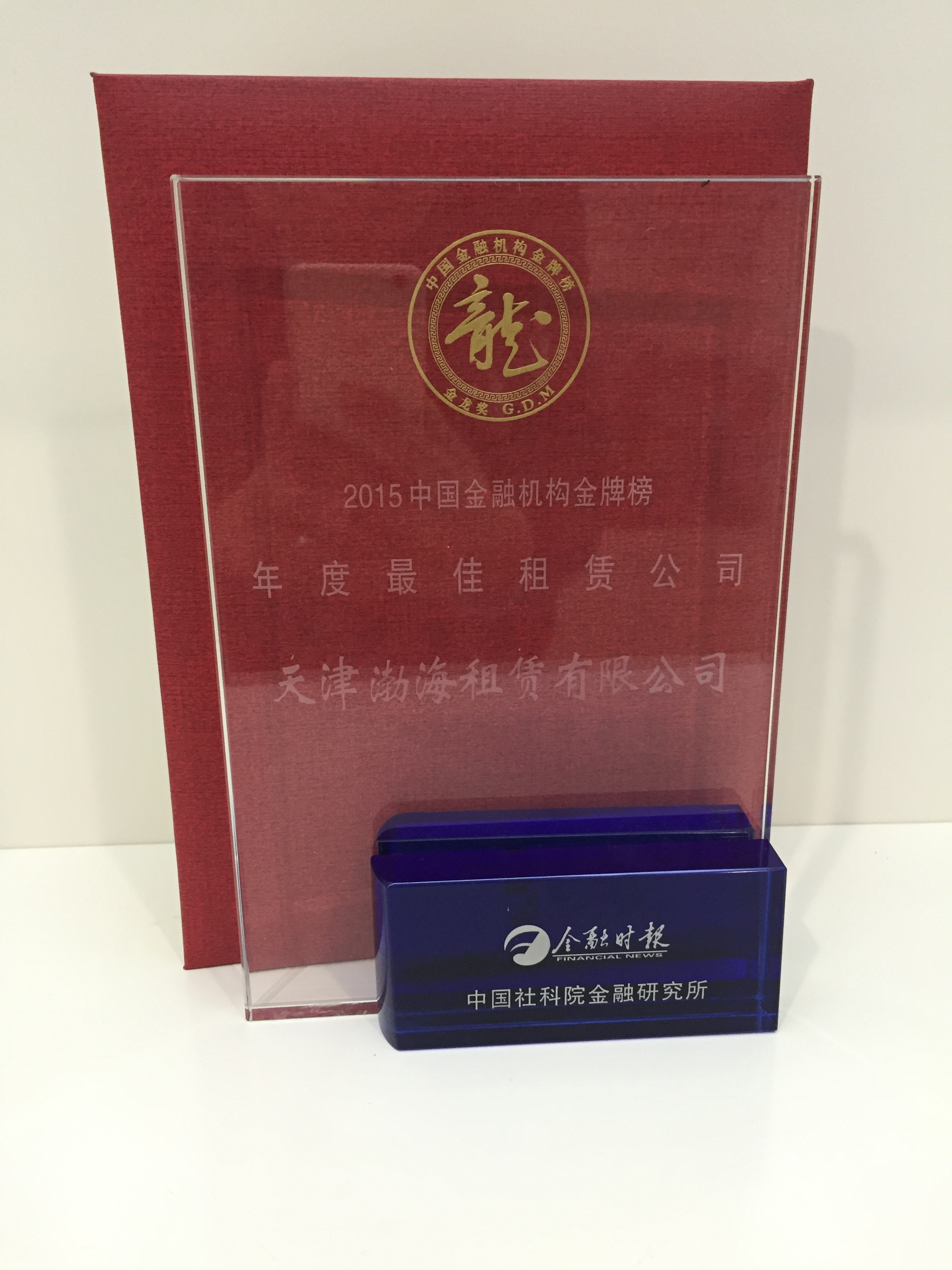 2015年12月18日,由金融時報社主辦的2015金融時報年會在北京金融街威斯汀大酒店召開。會議頒布了由金融時報社主辦、中國社科院金融研究所聯(lián)合舉辦的“2015中國金融機構(gòu)金牌榜?金龍獎”評選活動的評選結(jié)果,天津渤海租賃有限公司榮獲“年度最佳租賃公司”大獎。